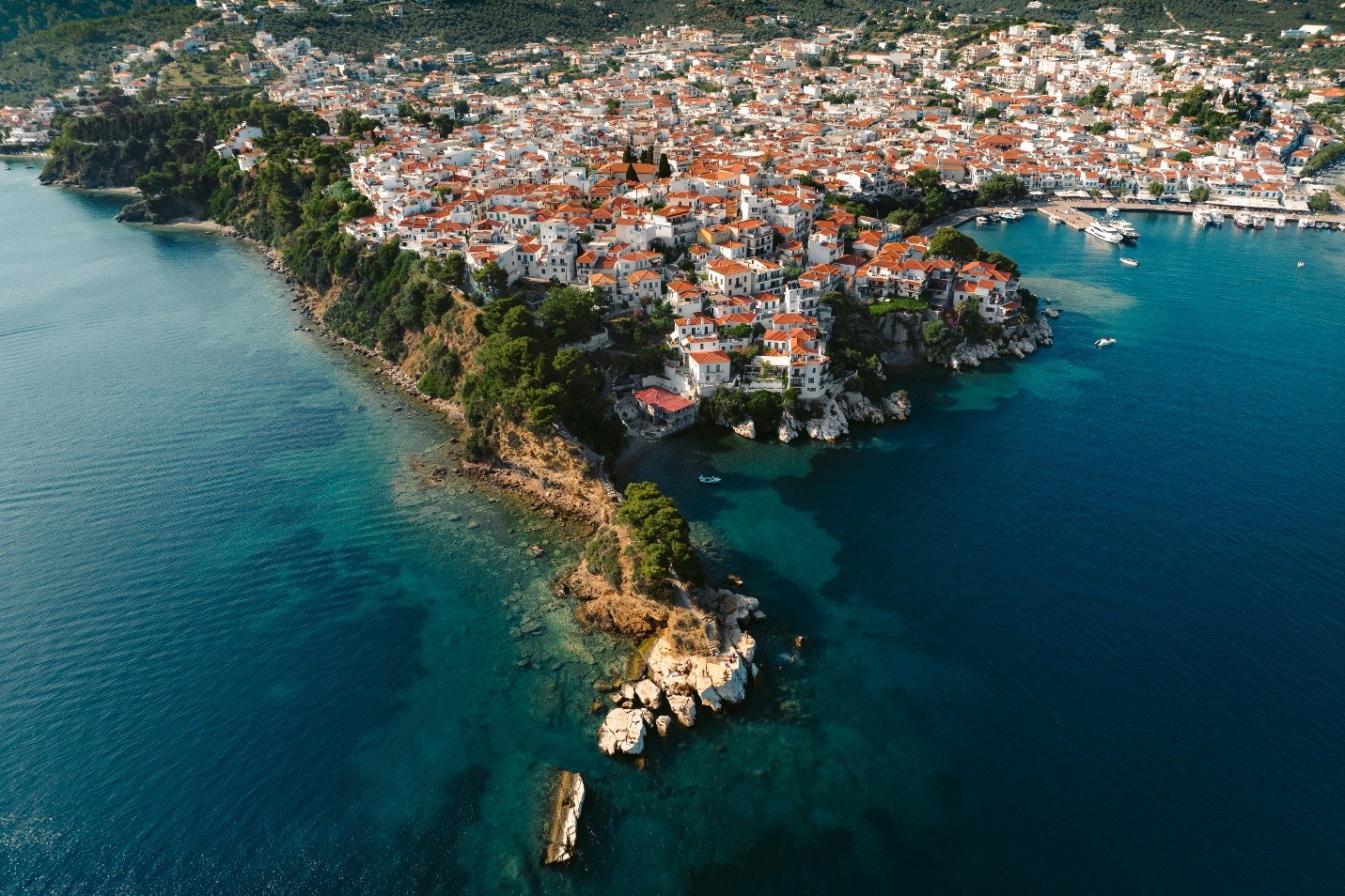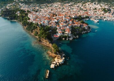 Its socio-economic profile is strongly tourism-driven, with core activity concentrated in accommodation, food services, and related services, supported by key visitor infrastructure such as Skiathos Airport “Alexandros Papadiamantis” and the island’s port system. During the summer peak, the seasonal daily population is estimated to rise to approximately 55,000 to 60,000 people (local estimate, reflecting intense seasonality).